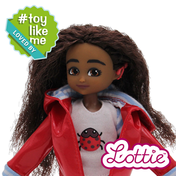 Image shows Lottie Mia doll in red jacket with long brown hair and red cochlear implant hearing aid.